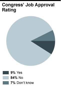 Moreover, congressional disapproval is not confined to one party: more than four out of five Republicans, Democrats, and Independents (83 percent, 83 percent, and 85 percent, respectively) disapprove of the job Congress is doing.