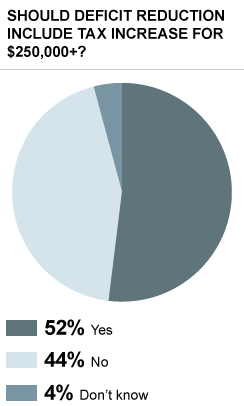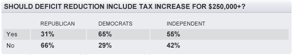 Democrats and Republicans are on opposite sides of the fence on this issue: 66 percent of Republicans think people in high-income households should not pay more in taxes, while 65 percent of Democrats think they should. Fifty-five of independents agree with the Democrats. (see chart below)Even most of those who fall into the upper income range support raising taxes for $250,000+ households. In the poll, 59 percent of those with household incomes over $100,000 said they would support higher taxes for those making $250,000+ for deficit reduction (39 percent do not).
