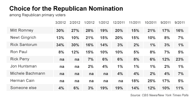 In the months leading up to the Iowa caucuses in January - the first contest - Mitt Romney's support remained steady in national polls, while support for other candidates surged and fell. (See graph below showing CBS News and CBS News/New York Times Polls showed Rick Perry, Herman Cain, Newt Gingrich and Rick Santorum surging - and dropping - at various points during the campaign.)
