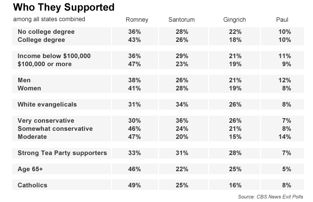 CBS News Exit Polls reflect what the national polls showed. In all the states in which exit polling was conducted, Romney was the clear winner among those with college degrees and voters with incomes of $100,000 or more. Romney also won among moderates and those who described themselves as somewhat conservative. He won among both men (by 12 points) and women (by 13 points).