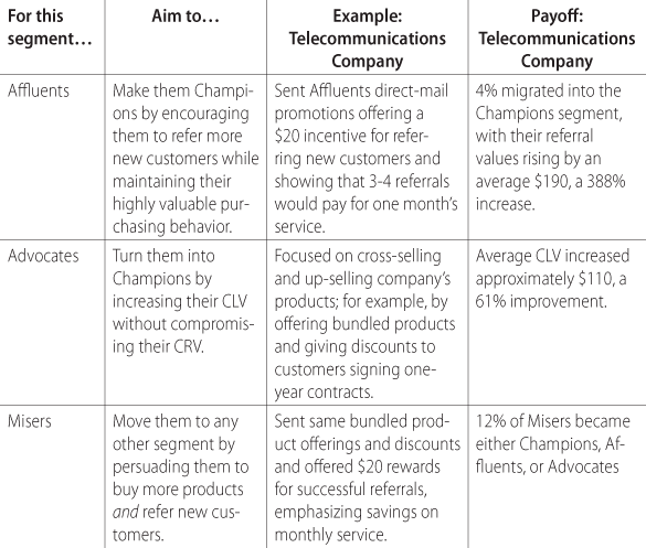 Since a high customer lifetime value doesn't necessarily predict high referral value, segment customers based on how they measure up on both forms of value. Champions, who are both excellent buyers and marketers; Affluents, who buy a lot but don't market well; Advocates, who don't buy a lot but are strong marketers; and Misers, who neither buy much nor market well.