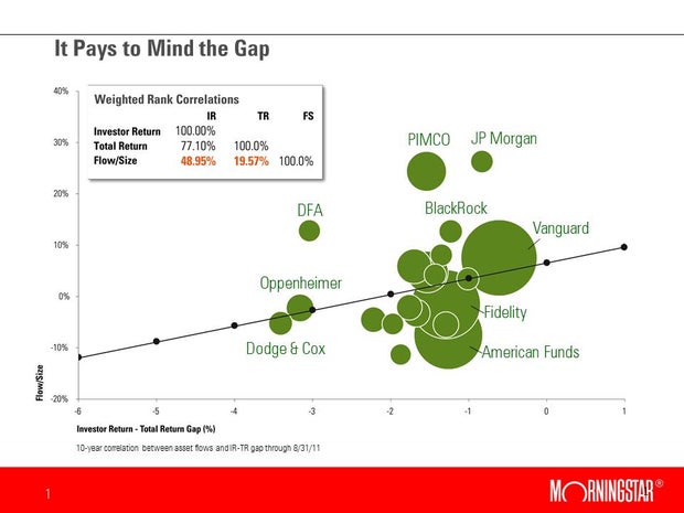 (MoneyWatch) It's a fact of investing life that investors tend to chase performance by moving into what has recently been hot. That's why for every single fund family, the returns investors have actually received over the past 10 years have lagged the performance of the funds themselves. (Investors don't actually put their money into the fund until after it has performed well, so they miss some, if not all, of the upside.) And according to a Morningstar analysis titled "It pays to mind the gap," the larger the lag, the more trouble the fund family has had gathering assets.