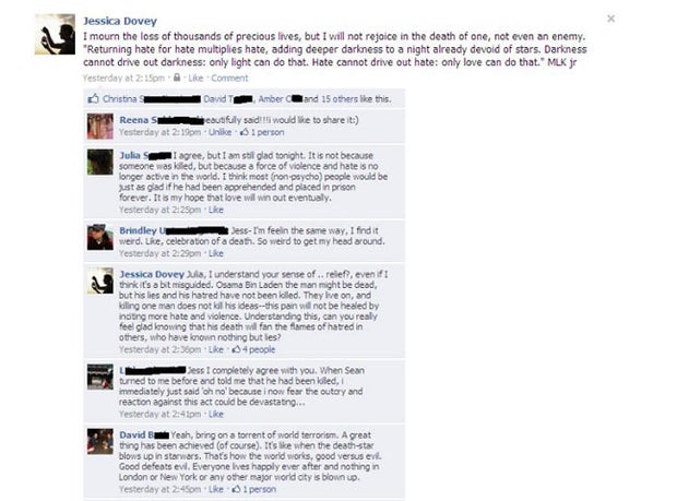 Second, the misquote is important in itself. Dovey's words resonated with people so much so that when the source was called into question -- potentially discrediting the quotation -- people passionately sought for the truth. Her words expressed a feeling that was lacking in the zealous celebrations over the murder of Osama Bin Laden, and therefore, they became news.