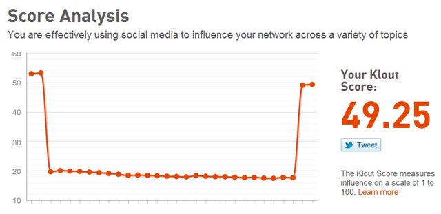 The bug had literally gone unseen by the media, but in one of my infrequent checks of the site, I noticed that early in May my own score had gone from 50 to 18 overnight without explanation. The dashboard showed that on Twitter I had no retweets, no mentions, no followers, and no one I was following -- all of which was incorrect. All that it showed were dashes.
