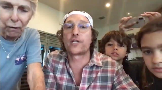 In the video, McConaughey tells viewers the best way to help front-line workers and scientists working on vaccines is to stay at home.