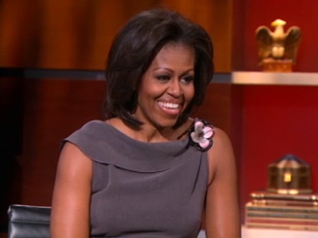 (CBS/AP) First lady Michelle Obama appeared on "The Colbert Report" Wednesday to plug the anniversary of her Joining Forces initiative, designed to honor U.S. troops and their families, particularly by helping find employment for veterans returning from war.