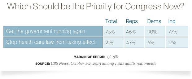 By a large margin, Americans say the higher priority for Congress should now be getting the government running again, rather than trying to stop provisions of the health care law from taking effect. But there are striking partisan differences here. Most Democrats and independents think Congress should focus on getting the government running, while for 47 percent of Republicans the priority for Congress is to stop the health care law.