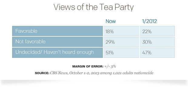 Some lawmakers associated with the tea party have strongly opposed any resolution that does not defund or delay the 2010 health care law. Just 15 percent of Republicans think the tea party has too much influence in their party, while 41 percent say the tea party has the right amount of influence, and 30 percent think it has too little.