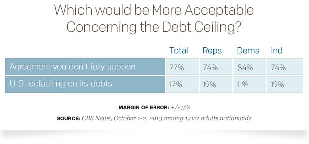 Even as the budget battle rages on, the Treasury Department has laid down another deadline in two weeks - a default on the government's debts unless the federal debt ceiling is raised on or before Oct. 17. A large majority of Americans - 77 percent - thinks it's more acceptable to reach an agreement on the debt ceiling that they don't fully support rather than have the U.S. go into defaults on its debts.