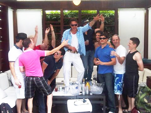 In one of the pictures he posted, Arquette is seen posing poolside with an ab-baring brunette, while another shows him on a coffee table in a cabana, "enjoying a little gay dance [party]."