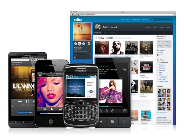 Rdio (http://www.rdio.com/) - Rdio seems to be the darling music streaming service of the tech community. It doesn't limit your library to what you've uploaded and allows you to listen to your friends' songs. Plus, it supports playing even while offline. Their app is available on iPhone, BlackBerry and Android, and costs only $4.99 a month.