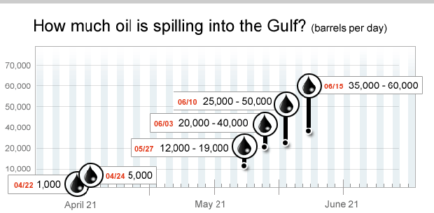 As he returned the government announced that it had revised its estimate upwards of how much oil is spewing into the Gulf. The new estimate is that as much as 2.5 million gallons are entering the Gulf every day - for a potential total of 143 million gallons so far.