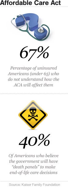 The Kaiser poll mentioned above found that, three years after it enactment, 67 percent of uninsured Americans under 65 years old (and thus not eligible for Medicare) still don't know how the Affordable Care Act will impact them. Among Americans overall, 57 percent said they didn't understand how they'd be impacted.
