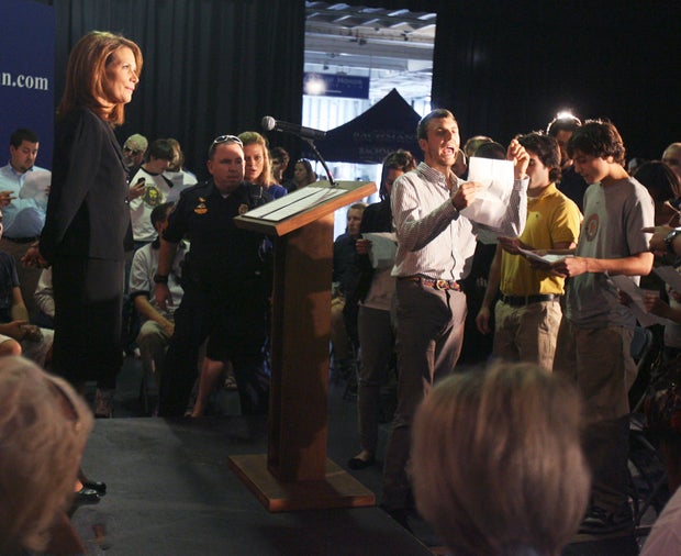 Some of her supporters in the crowd yelled "Sit down" to the protesters and chanted "Michele! Michele!" Bachmann left the podium with a police escort but returned a few minutes later to finish her speech.