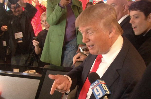 While he isn't an official candidate yet, you wouldn't know it from his schedule. After his press conference, the real estate magnate made a stop at a local diner, where he asked a number of people, "You going to vote for Trump?"