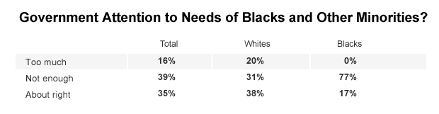 Whites and blacks see things differently. One in five white Americans think that the government is paying too much attention to the needs of minorities, while 31 percent think it is not paying enough attention. Among blacks, 77 percent think the federal government is not paying enough attention, and 17 percent said the government is paying the right amount of attention.