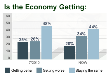 Thirty-four percent now say the economy is getting worse, up from 26 percent last month. Only 20 percent now say the economy is getting better, according to the poll, conducted Aug. 20 - 24. The last time views were this pessimistic was April of 2009.