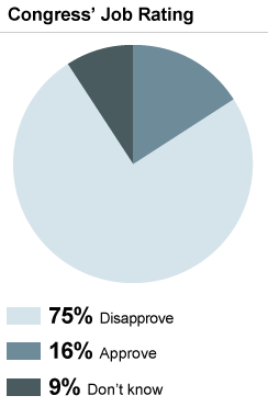 Seventy-five percent of Americans - three in four - say they disapprove of the job Congress is doing. That's up from 66 percent last month.