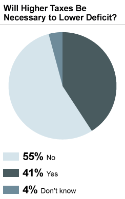 A majority - 55 percent - say higher taxes are not necessary to lower the deficit. Forty-one percent say tax increases are necessary.