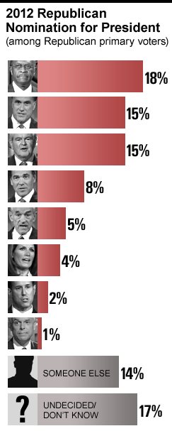This poll was conducted by telephone from November 6-10, 2011 among 1,182 adults nationwide. 1,029 interviews were conducted with registered voters and 382 with voters who said they plan to vote in a Republican primary. Phone numbers were dialed from samples of both standard land-line and cell phones.