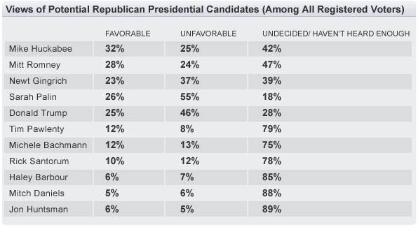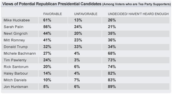 When respondents were asked their feelings about specific Republican hopefuls, the most "favorable" ratings went to former Arkansas Governor and 2008 presidential candidate Mike Huckabee. Fifty-four percent of Republican voters expressed a favorable view of Huckabee, followed by Sarah Palin with 51 percent, Mitt Romney with 42 percent, and Newt Gingrich with 42 percent.