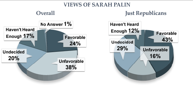 Only 7 percent of Democrats say they have a favorable view of Palin and 59 percent have a negative view. By contrast, 43 percent of Republicans have a positive view of Palin and 16 percent have a negative view.