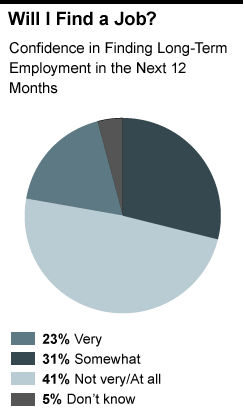 A majority of unemployed Americans, 54 percent, say they are confident they will find a permanent job in the next year. But just 23 percent are very confident, and 41 percent are either not very or not at all confident. Those who have been unemployed for over two years are particularly concerned: 54 percent are not confident they will find a job in the next year.