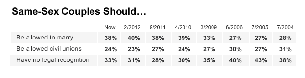 The views expressed in the new CBS News/New York Times poll have been relatively consistent for the past few years. Prior to that, however, support for same-sex marriage was lower. In 2004, just 28 percent said same-sex couples should be allowed to marry, and 38 percent thought their relationships should have no legal recognition.