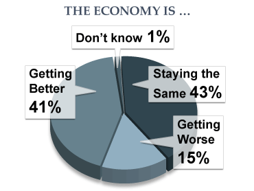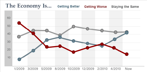 Forty-one percent now say the economy is getting better, up from 33 percent in April and just seven percent in January 2009. And while 54 percent said the economy was getting worse in January of last year, when the president took office, just 15 percent say so today.