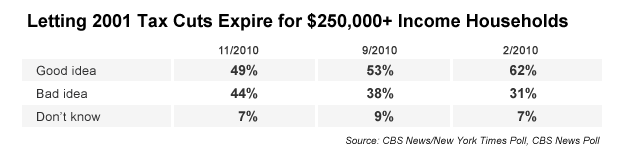When it comes to taxes, the public may be more reluctant to repeal something that already exists. When asked a year ago, in a very differently-worded question, whether the 2001 tax cuts signed into law by President George W. Bush should be allowed to expire for households earning $250,000 or more, a November CBS News Poll found nearly half, 49 percent, thought that was a good idea -- but nearly as many, 44 percent, thought it was a bad idea.