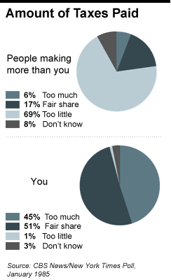 In general, polls have shown that many Americans think the rich just don't pay their fair share in taxes. A CBS News/New York Times Poll conducted in 1985 found 69 percent felt that "people who have more money than you" were paying too little in taxes - while they themselves were paying their fair share (51 percent) or even too much (45 percent).