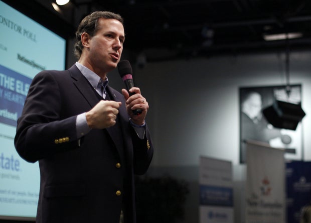 Santorum said his party has a habit of nominating moderate candidates who have been laying in wait and paying their dues. He said that's not a good recipe for victory, pointing to the general election losses of John McCain in 2008 and Bob Dole in 1996.