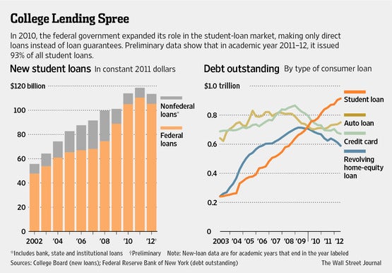 According to the Wall Street Journal, "since the end of 2007, just before the financial crisis hit, total student debt has grown by more than 56%, adjusted for inflation, the new Fed data show. During that time, overall household debt--including mortgages, student loans, auto loans and credit cards--fell by 18%, to $11.31 trillion as of Sept. 30."