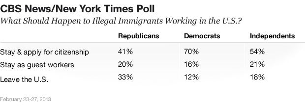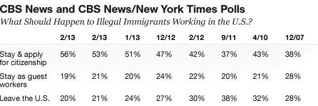 A February CBS News/New York Times Poll found support for allowing illegal immigrants working in the U.S. to stay and apply for citizenship was the highest seen in the poll since 2007; more than half of Americans favor that approach, a figure that has risen by double digits in the past year alone.