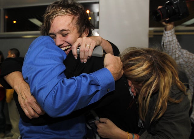 Derrik's mother, Joy Sweeney, told Hill that she remembers the first thing she said to her son when he got off the plane in St. Louis: "I think I just said 'I love you,' which is what I've been saying every single time I talk to him. I'm just so glad he's here."