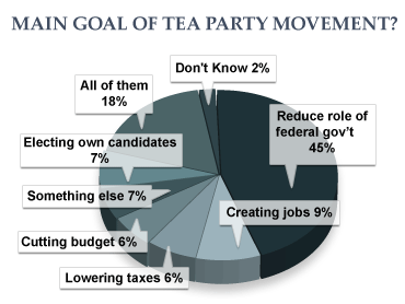 Nearly half say the main goal of the movement is to reduce the role of the federal government, far outdistancing any other consideration. Just seven percent say the goal of the movement is to elect Tea Party candidates.