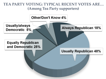 An overwhelming majority of Tea Party supporters, 84 percent, say the views of the Tea Party movement reflect the views of most Americans. But Americans overall disagree: Just 25 percent say the Tea Party movement reflects their beliefs, while 36 percent say it does not.