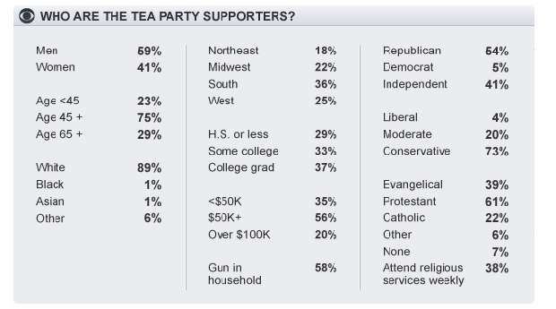 CBS News and the New York Times surveyed 1,580 adults, including 881 self-identified Tea Party supporters, to get a snapshot of the Tea Party movement. There is a lot of information to unpack; let's begin with the demographics.