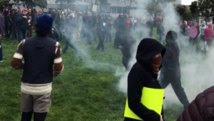 In Berkeley, California, Mr. Trump’s supporters fought counter-protesters during a march in support of the president. People wearing goggles, motorcycle helmets, gas masks or with their face half-covered with bandanas are pushing each other, throwing punches and hitting each other with the sticks holding their signs.