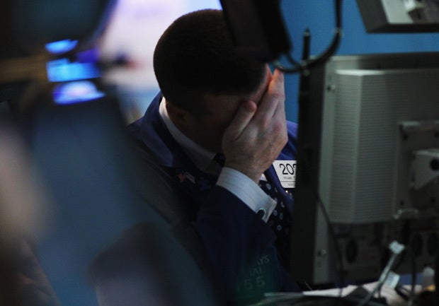 In the bond market, the yield on the 10-year Treasury note sank to 1.96 percent from 2.16 percent late Monday, a steep drop. Bond yields fall when their prices rise as investors buy assets that are considered to better hold their value during a slowing economy. The dollar rose to $1.36 for every euro.