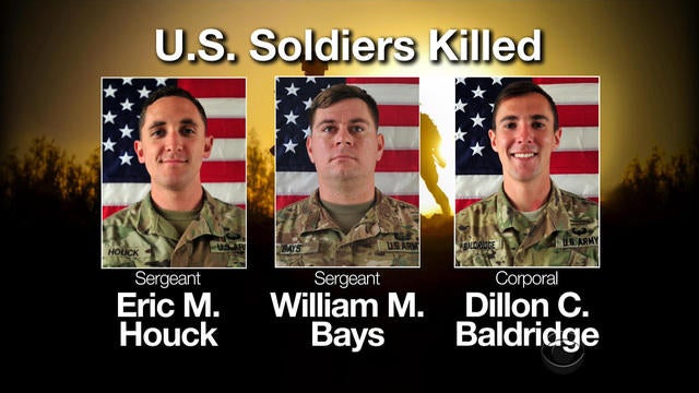 A statement on Monday identified the soldiers as Sgt. Eric M. Houck, 25, of Baltimore, Maryland; Sgt. William M. Bays, 29, of Barstow, California; and Cpl. Dillon C. Baldridge, 22, of Youngsville, North Carolina.