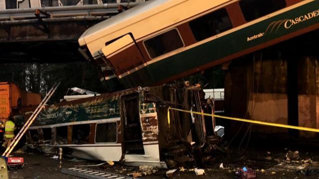 DUPONT, Wash. -- An Amtrak train derailed on an overpass in Washington state Monday morning, with some of the 14 train cars careening onto vehicles on a highway below. The crash left at least three people dead and roughly 100 injured, officials said, and authorities are still combing through the wreckage to find victims.