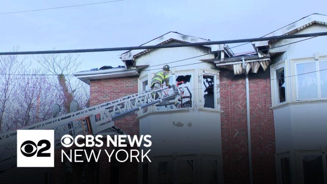 At least one person was injured in the massive house fire at a 2-family home in Fairview. CBS News New York's Noëlle Lilley reports.