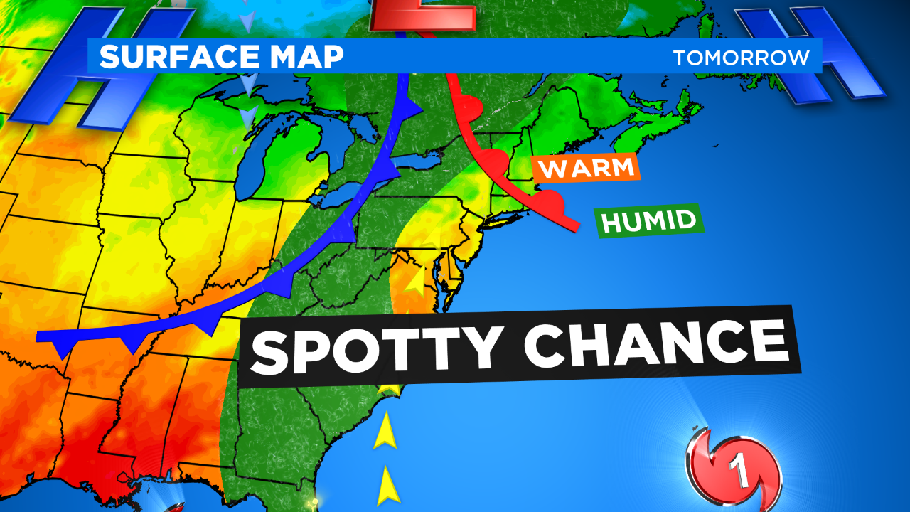 Tomorrow will feature more clouds overall along with a little bit more humidity. There is also a chance for spotty showers, maybe even a rumble, but by no means will it be a washout. Temps will be right around seasonable.