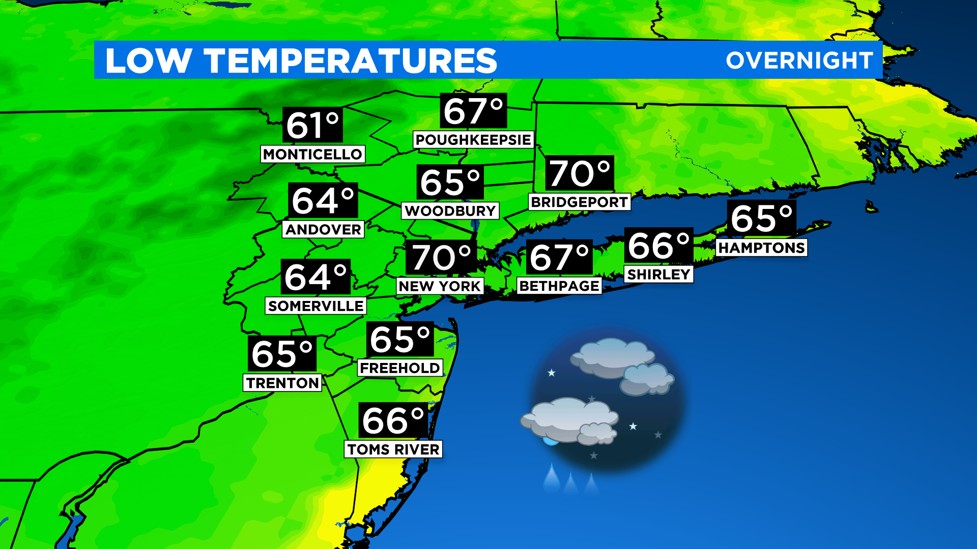 The shower risk goes up overnight, especially to the south and for coastal locations as a low approaches and passes by offshore. Lows tonight will be in the 60s; around 70 for NYC.
