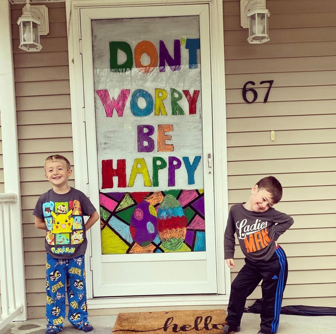 A New Jersey mom said her husband always lifts her spirits singing the song "Don't Worry, Be Happy." So she shared the words with her two sons, Dominic and Colton, painting them on the front door of their home.