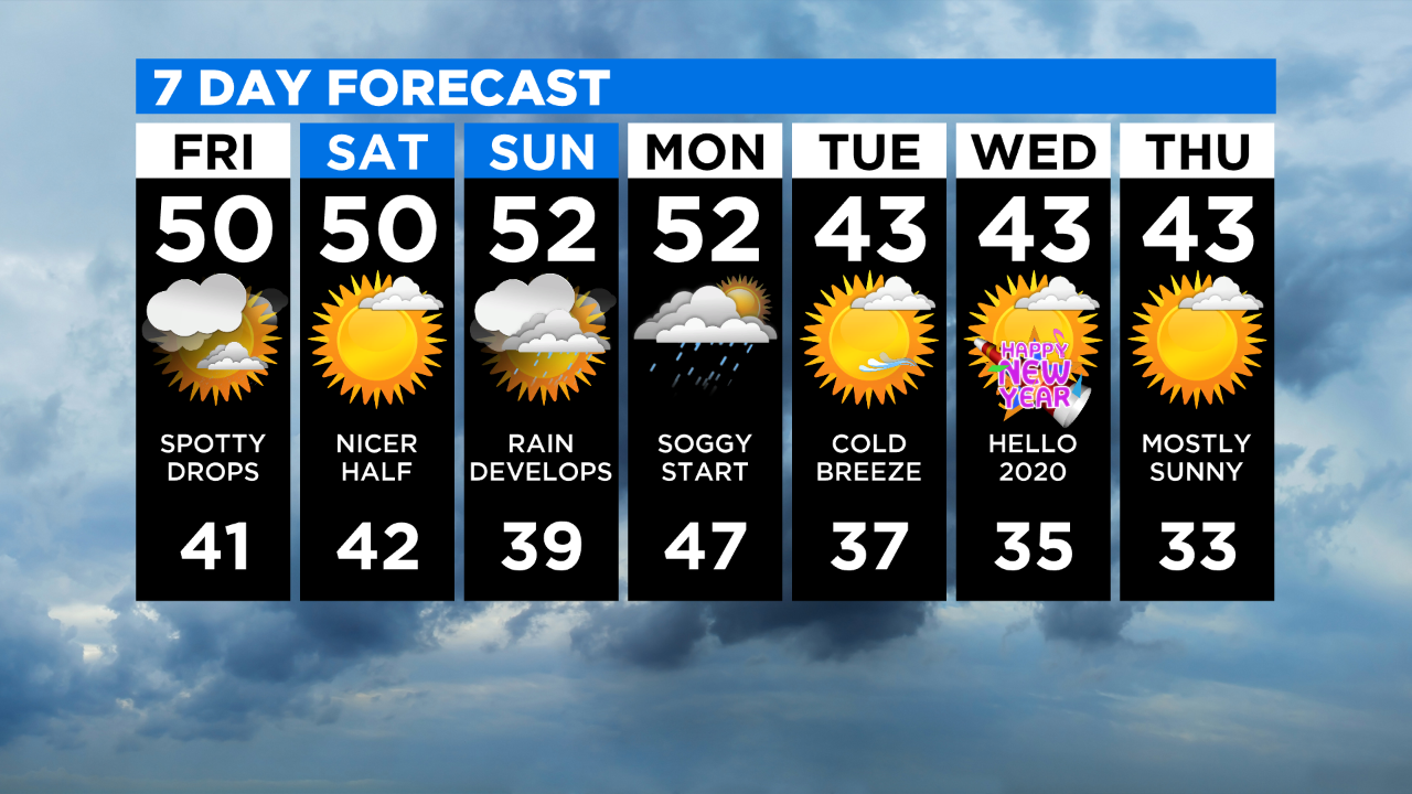 As for the all-important weekend forecast? Expect bright skies and dry conditions Saturday with a high near 50, and cloudy skies Sunday with rain developing late in the day with highs in the low 50s.