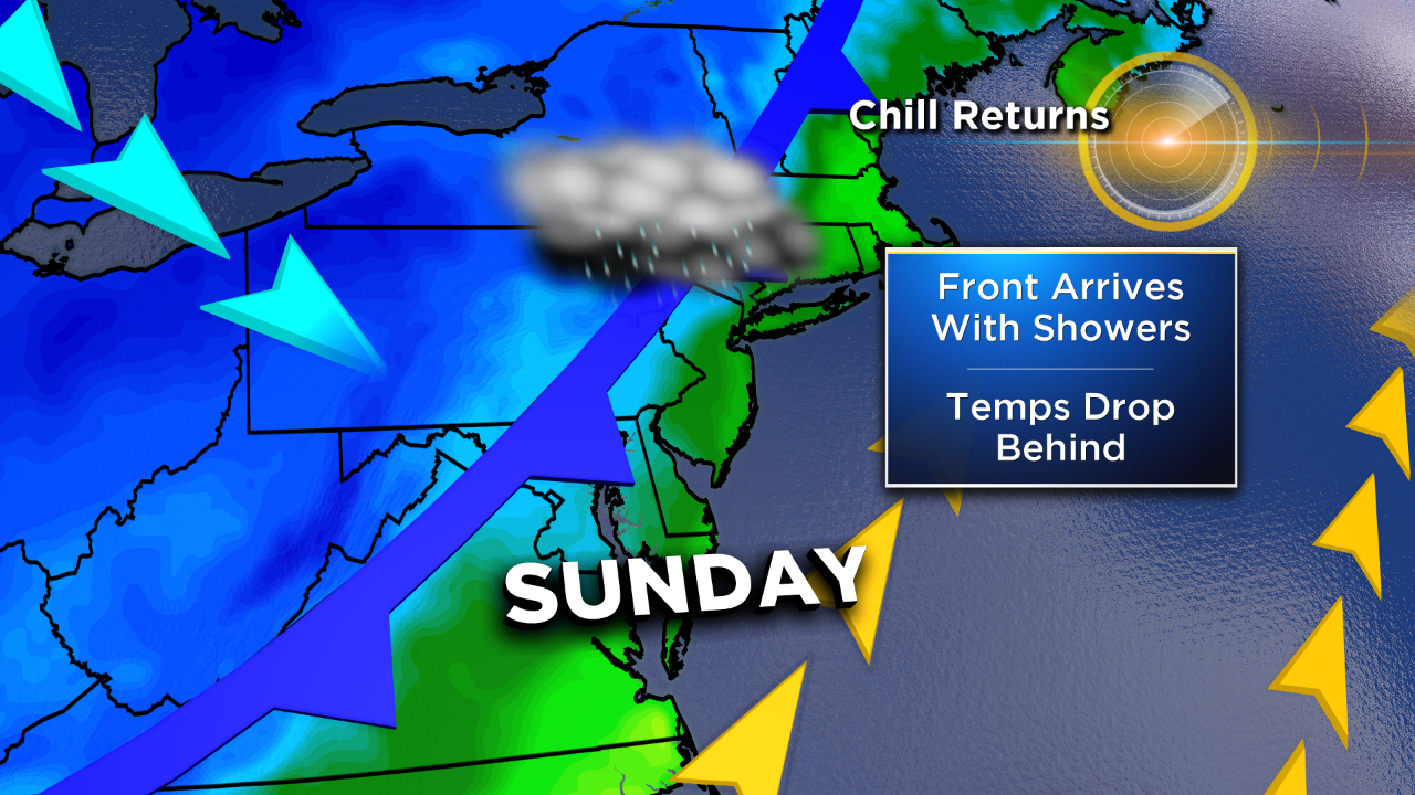By Sunday, the front that is currently stalled (and causing our clouds) finally moves through with a period of showers around midday. Temps fall from near 60 early into the 40s, and eventually 30s by night.
