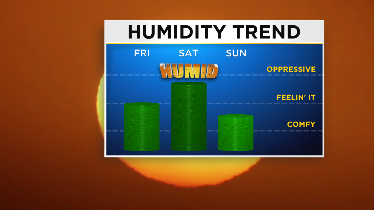 As for Sunday, expect a 30% chance of showers and storms with breezy and less humid conditions. Highs that day will be a little cooler in the low to mid 80s.