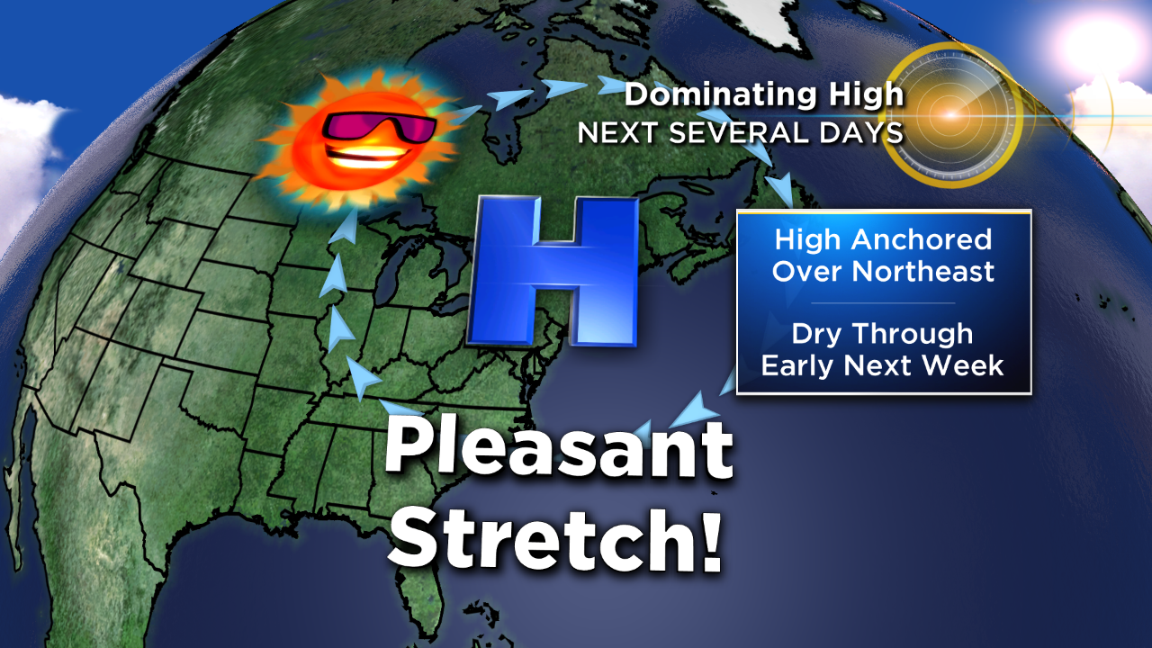 Your Friday afternoon looks picture perfect with high pressure dominating across the mid-Atlantic and Northeast. Expect temperatures to climb into the mid 80s or so with not-so-terrible humidity levels.